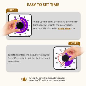 - EASY TO USE – Simply turn the control knob clockwise to expand the bright blue disk—making it easy to see the time count down visually Note: To activate the timer before each use, turn the control knob clockwise to the 55-minute position, then turn it counterclockwise to the desired time. About 70 decibels when the bell rings