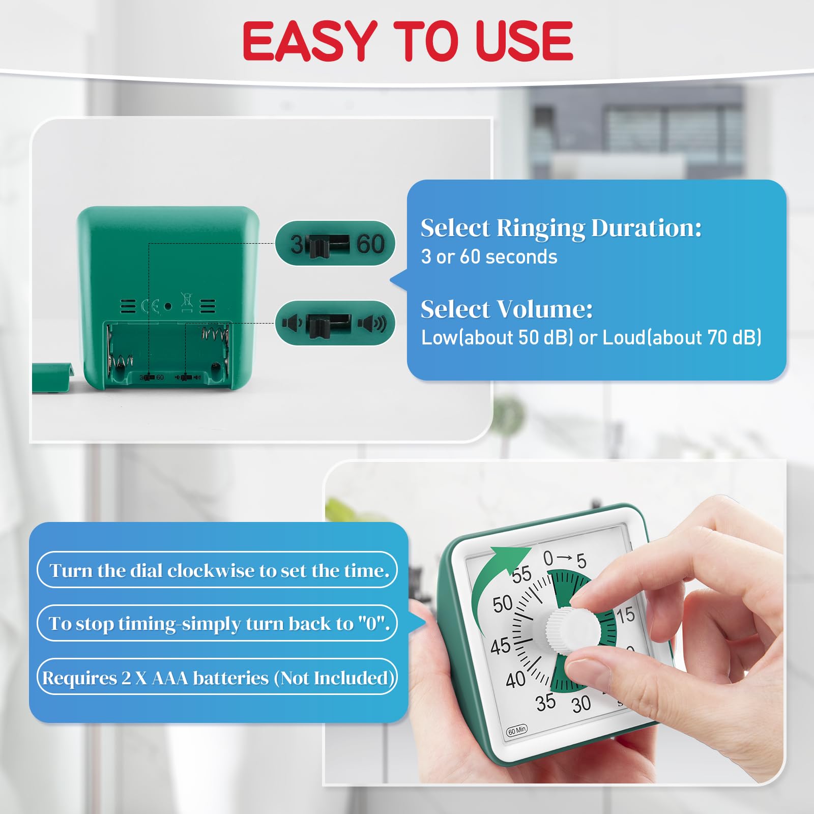 - Easy to Use — Turn the dial clockwise to adjust the time. To turn the timer off: turn it back to zero. Turn off the ringer: clockwise to “5” and then quickly back to “0”. It is non-perishable.